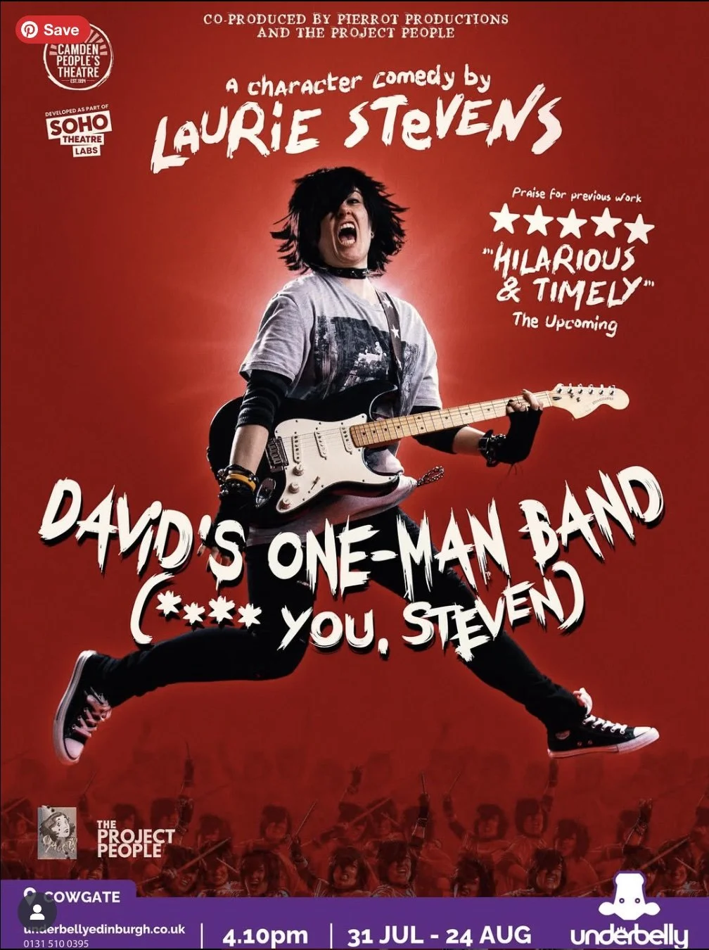 David is about to play the gig of a lifetime: headlining Sticky Floors, the coolest under-16s band night in the Bay Area. But when his bandmate flakes on their one shot at emo stardom, David must embark on his music career alone. David’s One-Man Band (F*ck You, Steven) is a character comedy with live music about a thirteen-year-old boy who dreams of being a rockstar. The emo love child of Freaks and Geeks and Spinal Tap, it’s a mid-noughties nostalgia bomb of teenage awkwardness, angsty poetry and songs with ridiculously long titles.